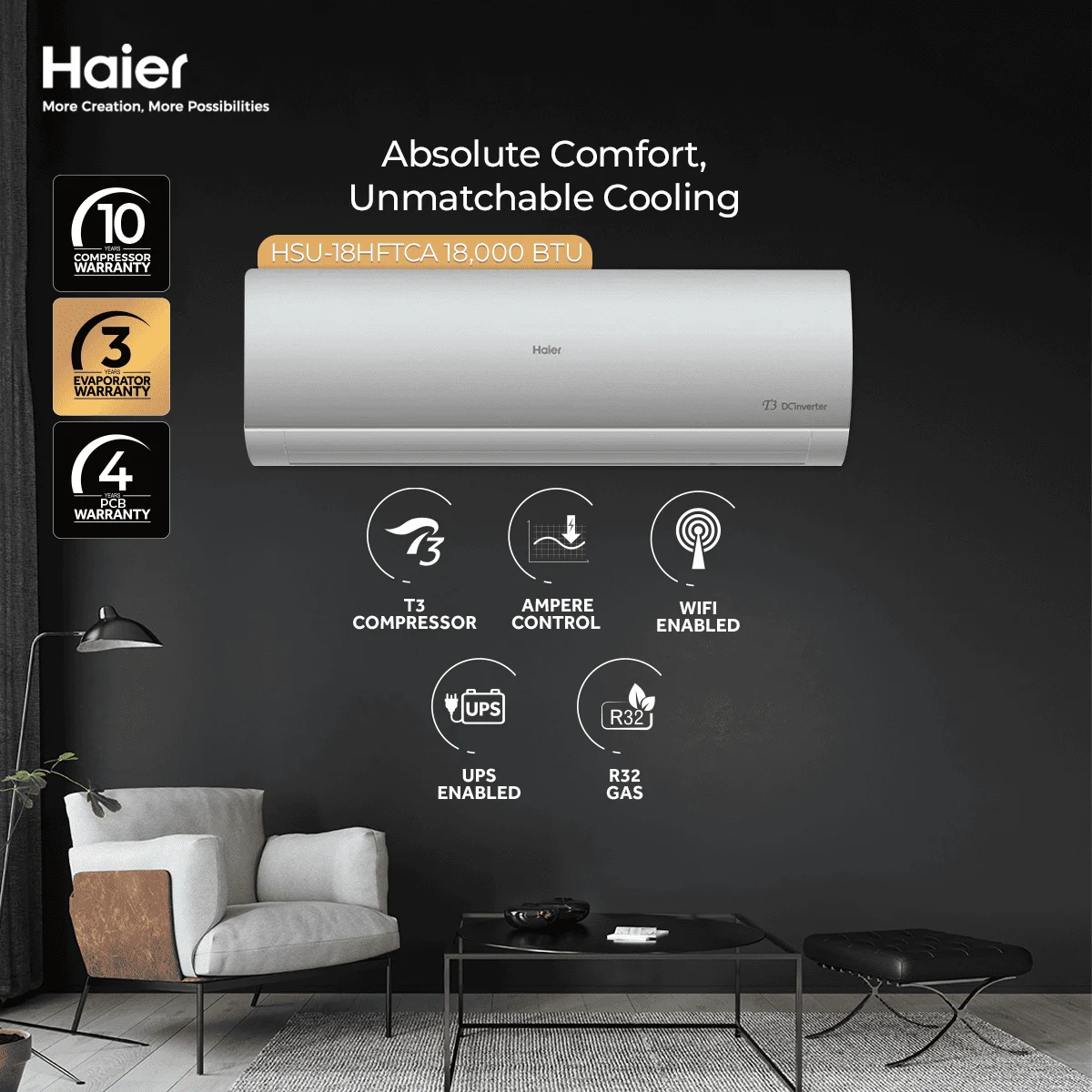 Equipped with T3 inverter technology and a robust compressor, this Haier AC maintains stable performance and energy‑efficient cooling. The DC inverter system intelligently adjusts power usage to reduce electricity consumption while providing rapid temperature control.